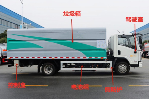 其它 | 1.該車裝備有垃圾箱體,液壓升降頂蓋,液壓尾板等專用裝置,用于實現(xiàn)垃圾桶的裝卸及運輸功能,頂蓋可向上開啟;2.尾板質(zhì)量為:450kg,尾板收起的水平狀態(tài)為:200mm;3.側(cè)面防護裝置材料為鋁合金,連接方式為螺栓連接,后下部防護裝置為圓形管材料為Q235B,連接方式:螺栓連接,后部防護裝置截面尺寸為直徑110mm,離地高度:440mm;4.儲能裝置類型/生產(chǎn)廠家:磷酸鐵鋰電池/寧德時代新能源科技股份有限公司;電機額定功率/峰值功率:60kW/110kW;5.ABS型號/生產(chǎn)廠商為:ABS/ASR-12V-4S/4M/襄陽東風(fēng)隆誠機械有限公司.6.該車型可選裝車載ETC裝置;7.該車型選裝不同尺寸的垃圾箱體,標準型時整車長:6650mm,整車寬為:2100mm/2140mm,整車高:2520mm,后懸:1672mm加長型箱體時整車長:6750mm/6850mm,整車寬為:2140mm/2200mm,整車高:2615mm/2710mm,后懸:1772mm/1872mm,標準型與加長型箱體整備質(zhì)量在誤差范圍內(nèi),忽略不計;8.該車型可選裝輕量化箱體,整備質(zhì)量/額定載質(zhì)量:5200kg/3100kg,隨底盤選裝駕駛室外觀.選裝后部外觀結(jié)構(gòu) | ||