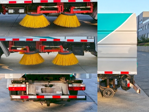 3. 采用“中置四掃盤+噴霧降塵裝置+中心隔板+后置吸嘴”的結(jié)構(gòu)布局,讓清掃過程中砂石不在飛濺揚(yáng)塵,此布局便于清掃裝置與吸盤的調(diào)整與維護(hù),轉(zhuǎn)場(chǎng)作業(yè)時(shí)整車通過性好。