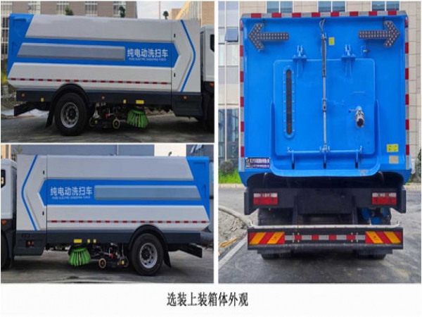 其它 | 該車僅選用5300軸距,裝有吸盤、掃盤、水箱等裝置,用于道路洗掃作業(yè);2.側(cè)防護(hù)由專用裝置和防護(hù)欄組成,防護(hù)欄材料:鋁合金,螺栓連接;后下部防護(hù)材質(zhì):Q235,螺栓連接,截面尺寸240mm×60mm,離地高度490mm;3.儲能裝置種類/單體生產(chǎn)企業(yè)/儲能裝置生產(chǎn)企業(yè):磷酸鐵鋰蓄電池/湖北億緯動力有限公司/湖北億緯動力有限公司,磷酸鐵鋰蓄電池/寧德時代新能源科技股份有限公司/寧德時代新能源科技股份有限公司;電機的額定/峰值功率分別為:120kW/180kW;4.ABS型號:CM4XL-4S/4M,生產(chǎn)廠家:廣州瑞立科密汽車電子股份有限公司;5.該車型安裝有具有衛(wèi)星定位功能的行駛記錄儀,可選裝ETC車載裝置,選裝外觀箱體. | ||